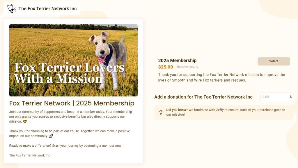Fox Terrier Network is currently testing the Zeffy portal for donations and annual membership fees. When you click on any of the buttons below, the new page should look like this: